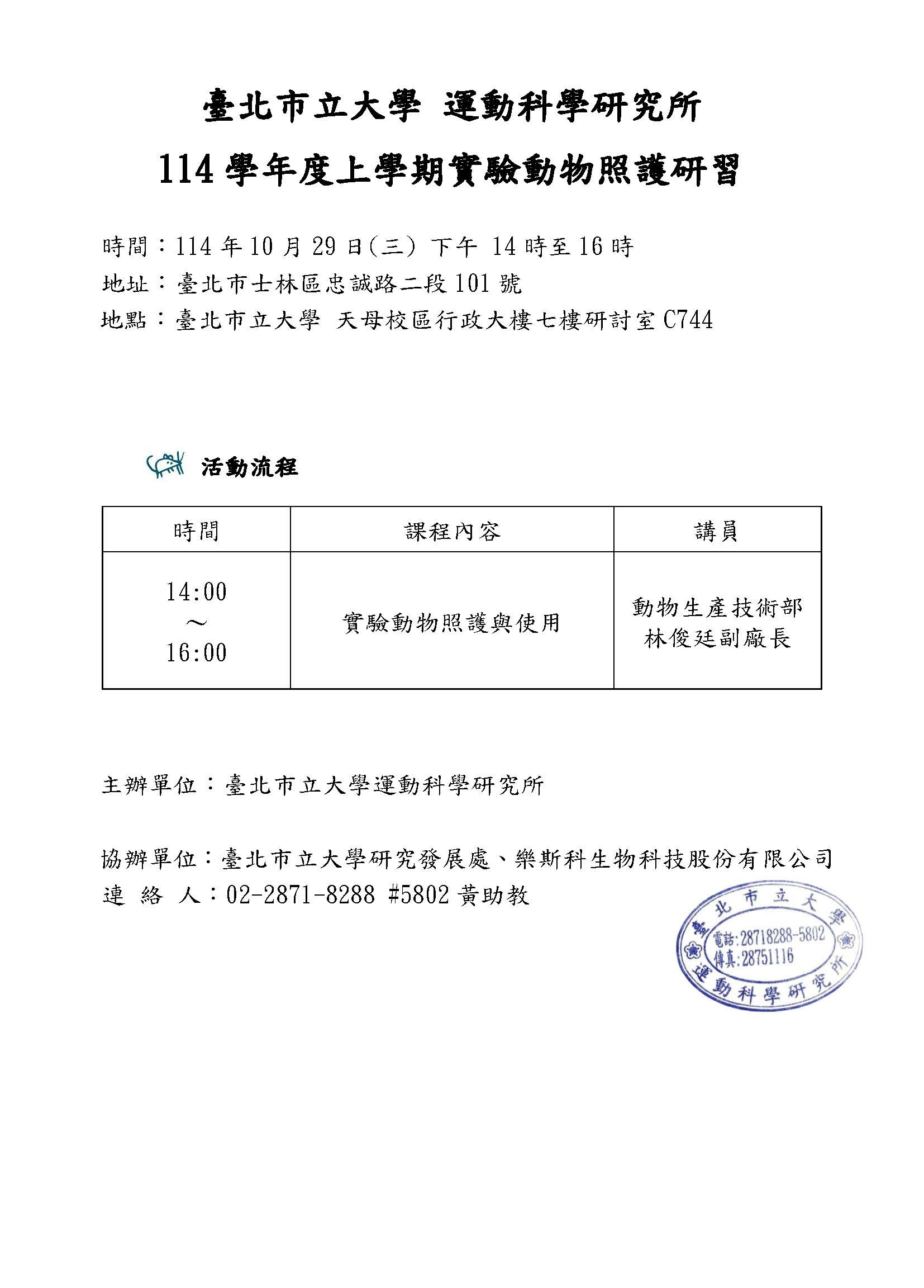 【演講公告】本所將於114年10月29日(三),舉辦「114學年度上學期實驗動物照護研習」,敬請師生踴躍參加。